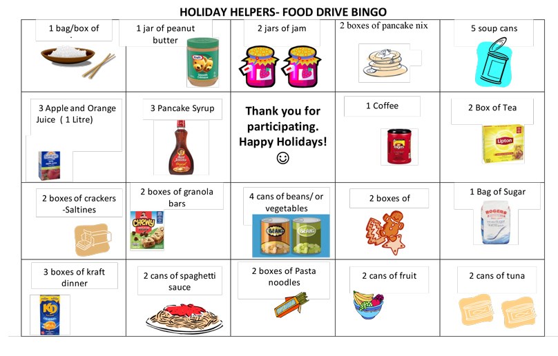 Holiday Bingo is under way, be sure to bring your food items to your homeroom, the class with the most food items, WINS a movie with the popcorn machine- Lets help out some of the seniors who live in our community, every little bit helps to brighten someone else's day!!! Dec 7 is the last day to bring in your food items. Download printable copy under Resources.